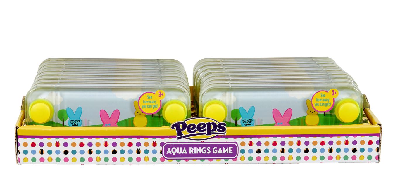 Nostalgic Game Play. Simply press the buttons to see if you can get the rings on the stand. This product features cute PEEPS graphics.